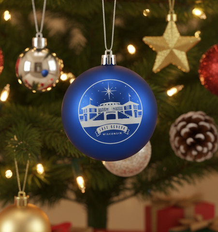 Show you love for Lake Geneva with this original artwork by Neal Aspinall. It shows the iconic Riviera Ballroom. Ornament has a beautiful blue sheen to it, and is signed on the back in silver marker. He can add a short message too if requested.